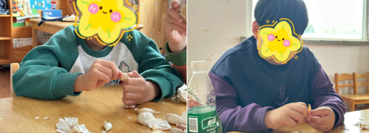 对于普通孩子而言,这是一个简单的动作,但对于这些在精细动作方面存在挑战的孩子们,却是一次不小的考验。他们需要调动手指的力量,用指尖紧紧地捏住滑溜溜的蒜瓣,寻找那层薄薄外衣的缝隙,然后或捻或剥,小心翼翼地将其分离。