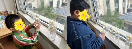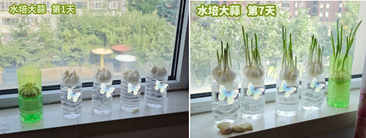 清水中的蒜瓣底部,慢慢长出雪白的根须,像老爷爷的胡须;顶部则悄然钻出嫩绿的尖芽,一天比一天高。这一周,等待不再是抽象的概念,而是化为了眼前这抹日渐浓郁的绿色。通过透明的瓶身,孩子们直观地看到了生命孕育的过程,懂得了水与阳光是生命的源泉。这份对植物生长的感知与期待,潜移默化地培养了他们的耐心、责任心和观察力。