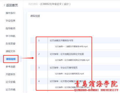 3.点击【课程视频】对选题、开题报告、论文撰写等环节进行系统学习。