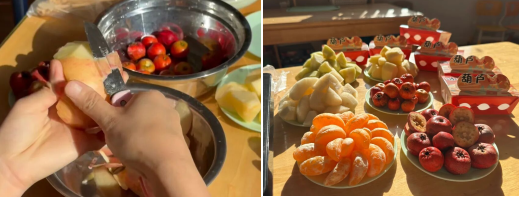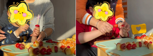 在老师的辅助下,孩子们将切好的水果精心排列成盘,又小心翼翼地将它们串成五彩斑斓的“果实项链”。动作或许稍显笨拙,神情却无比专注。