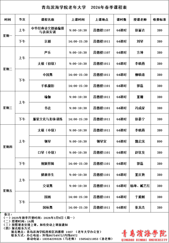 后附:青岛滨海学院老年大学2026年春季课程表(选课参考)