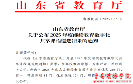 根据《山东省教育厅关于开展2025年度继续教育数字化共享课程遴选的通知》(鲁教民函〔2025〕15号)要求,经我校组织专家评审,组织申报,教育厅专家评审,遴选出 2025 年山东省继续教育数字化共享课程 205 门, 其中,精品课程 81 门,优质课程 124 门。我校申报的《英语魔“法”棒》课程被评为“山东省继续教育数字化优质课程”。