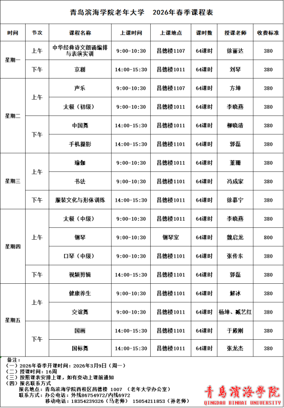 青岛滨海学院老年大学2026年春季学期各班级,定于3月9日(周一)起陆续开学,本学期授课16周,请全体师生按所报课程时间到校上课。