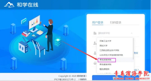 默认学校为“青岛滨海学院”,默认端口为“学生端”登录账号:学号